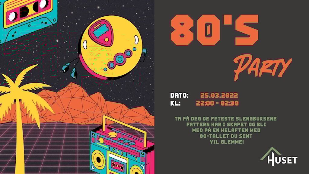 Ta på deg de feteste slengbuksene fattern har i skapet og bli med på en helaften med 80-tallet du sent vil glemme!HUSET stiller med DJ og dansegulv, dette blir fett!