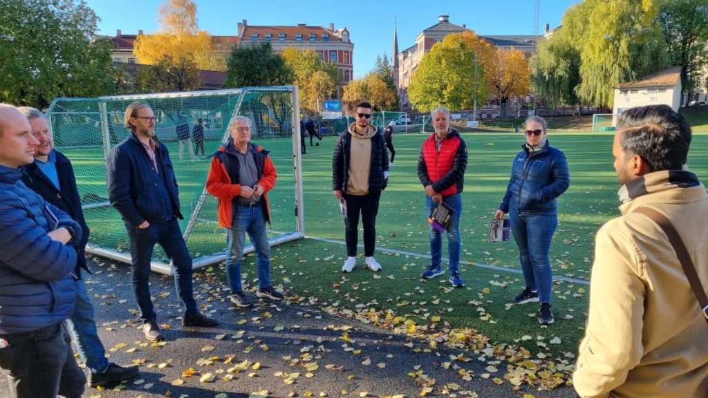 Seby møter Grüner fotball. Onsdag 27. oktober ble det gjennomført en befaring på Dælenenga for å avtale plassering av Grüner fotballs midlertidige lokaler. Med på befaringen var ogås assisterende prosjektleder fra Oslo bygg, Senthalan Sellathurai til høyre. Nummer tre fra høyre med rød jakke er byggeleder Kjetil Næss fra Seby.